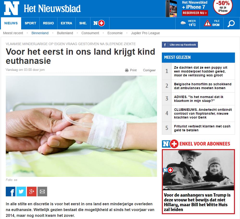 Για πρώτη φορά, αφότου εγκρίθηκε ο νόμος το 2014, ένας ανήλικος υποβλήθηκε σε ευθανασία έπειτα από αίτημά του στο Βέλγιο, γράφει σήμερα η φλαμανδόφωνη εφημερίδα Het Nieuwsblad.