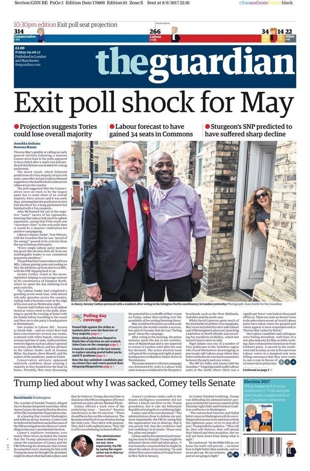 «Το μεγάλο στοίχημα της Μέι απέτυχε», είναι ο πρωτοσέλιδος τίτλος των Times. Η εφημερίδα υπογραμμίζει ότι το όνειρο της πρωθυπουργού να ενισχύσει την πλειοψηφία της «φαίνεται ότι έγινε συντρίμμια».