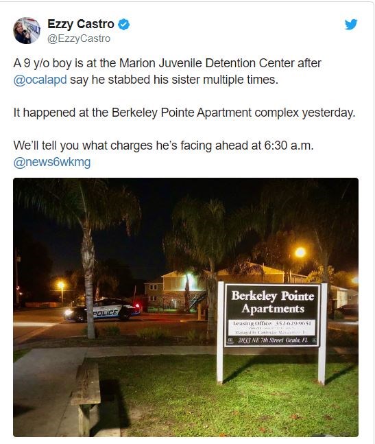 Ένας εννιάχρονος συνελήφθη τη Δευτέρα το απόγευμα όταν η αστυνομία τον εντόπισε να κρύβεται σε ένα υπόστεγο στο συγκρότημα διαμερισμάτων στην Οκάλα της Φλόριδα όπου μένει, αφού μαχαίρωσε και τραυμάτισε την πεντάχρονη αδερφή του.