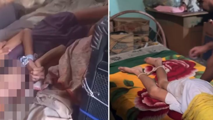 Οι φωτογραφίες που δημοσιεύθηκαν δείχνουν τη μία κόρη με τα πόδια δεμένα μεταξύ τους, ενώ η άλλη είναι λιπόθυμη σε ένα βρώμικο κρεβάτι.