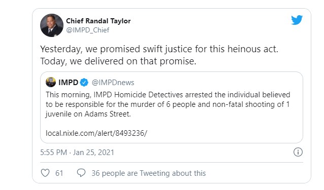 Ο δολοφόνος, ο οποίος δεν έχει κατονομαστεί από τις αρχές λόγω της ηλικίας του, συνελήφθη τη Δευτέρα, αφού οι αστυνομικοί τον παρακολούθησαν μέχρι το προάστιο του Plainfield, Ind.