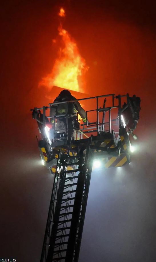Τα τοπικά μέσα ενημέρωσης αναφέρουν ότι ακούστηκαν εκρήξεις και ότι είδαν σπινθήρες να πετάγονται από τα κτίρια που καίγονται.