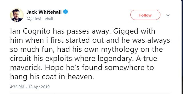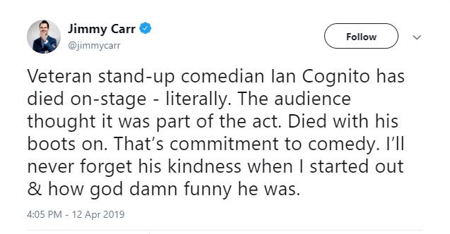 Σοκαρισμένοι είναι οι συνάδελφοι του Ίαν Κόγκνιτο, του διάσημου Βρετανού stand up κωμικού, που πέθανε ενώ έδινε παράσταση. Ο ηθοποιός κάθισε σε μια καρέκλα και έγειρε το κεφάλι, με το κοινό να νομίζει πως είναι μέρος της παράστασης, καθώς λίγα λεπτά πριν είχε αναφέρει ότι παθαίνει εγκεφαλικό ή έμφραγμα.