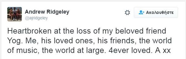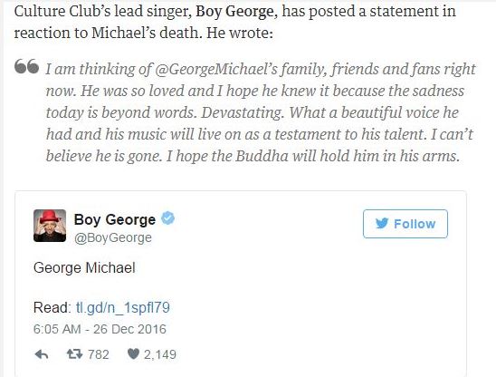 Ο Μπόι Τζορτζ έγραψε: «Ήταν τόσο αγαπητός και ελπίζω να το ήξερε, γιατί η θλίψη σήμερα είναι πέρα από τις λέξεις».