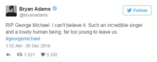 “Δεν μπορώ να το πιστέψω. Ένας τόσο απίστευτος τραγουδιστής και ένα θαυμάσιο πλάσμα, τόσο νέος για να φύγει” ήταν τα λόγια του Καναδού τραγουδιστή Μπράιαν Άνταμς.