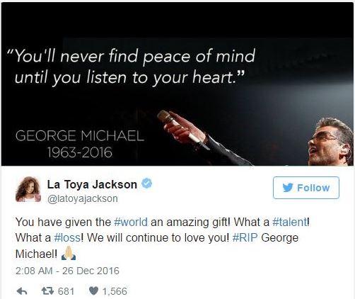 Η ΛαΤόγια Τζάκσον έγραψε επίσης: «Έδωσες στον κόσμο ένα καταπληκτικό δώρο! Τι ταλέντο! Τι απώλεια»!