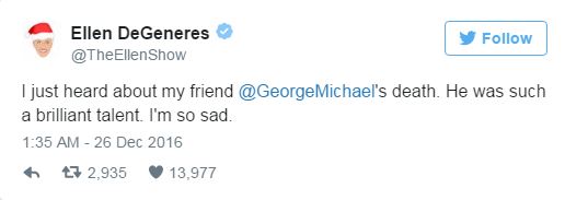 “Μόλις έμαθα για τον θάνατο του φίλου μου Τζορτζ Μάικλ. Ήταν ένα τόσο λαμπρό ταλέντο. Είμαι πολύ λυπημένη” έγραψε στην ανάρτησή της η διάσημη παρουσιάστρια Έλεν Ντε Τζένερες.
