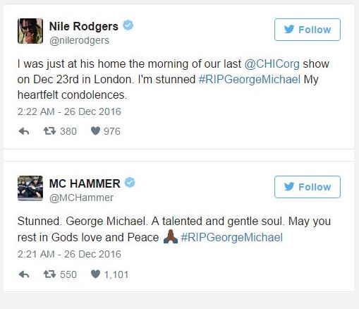«2016 – απώλεια ακόμα μιας ταλαντούχας ψυχής. Όλη μας την αγάπη και την συμπάθεια στον Τζορτζ Μάικλ», έγραψε το συγκρότημα Duran Duran.