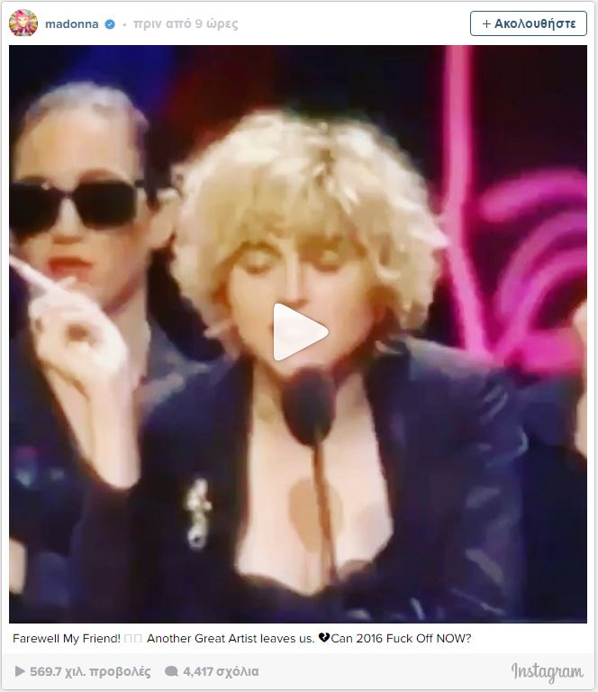 «Στο καλό φίλε μου! Ακόμα ένας σπουδαίος καλλιτέχνης μας αφήνει. Μπορεί το 2016 να πάει να γ… ΤΩΡΑ», είναι το γεμάτο θλίψη και οργή μήνυμα που ανέβασε η Μαντόνα στον λογαριασμό της στο Instagram, μαζί με ένα βίντεο όπου η ίδια βραβεύει τον εκλιπόντα τραγουδιστή.