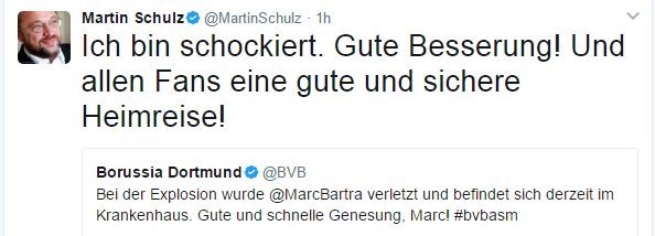 Το σοκ τους για την επίθεση που δέχθηκε το πούλμαν που μετέφερε την αποστολή της Μπορούσια Ντόρτμουντ στο γήπεδο για την αναμέτρηση του Champions League με τη Μονακό και τη συμπαράστασή τους στον γερμανικό σύλλογο και τον τραυματία Μαρκ Μπάρτρα, εξέφρασαν η Γερμανίδα καγκελάριος Άνγκελα Μέρκελ και ο υποψήφιος για τη γερμανική προεδρία και πρώην πρόεδρος του Ευρωπαϊκού Κοινοβουλίου Μάρτιν Σουλτς.