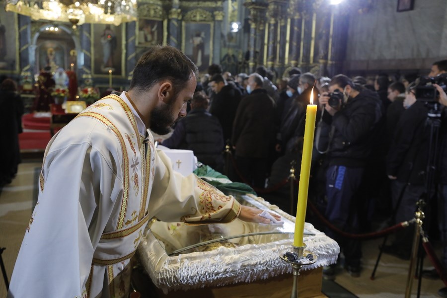 Σήμερα το πρωί τελέστηκε λειτουργία στον καθεδρικό ναό των Αρχαγγέλων με τη συμμετοχή πολλών ιεραρχών της Σερβικής Ορθόδοξης Εκκλησίας και την παρουσία εκατοντάδων πιστών, εντός και εκτός του ναού, λίγοι εκ των οποίων φορούσαν μάσκα.