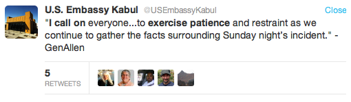 Η συγγνώμη του Μπαράκ Ομπάμα δεν ήταν αρκετή, αφού οι διαμαρτυρίες συνεχίζονται στο Αφγανιστάν, για το Κοράνι που έκαψαν Αμερικανοί στρατιώτες.Οι διαμαρτυρόμενοι για το Κοράνι περικύκλωσαν την Αμερικανική πρεσβεία στο Kabul, γεγονός που οδήγησε σε επεισόδια ,στη διάρκεια των οποίων έχασαν την ζωή τους 2 άτομα.Οι εργαζόμενοι της πρεσβείας έστειλαν ένα μήνυμα απόγνωσης στο Twitter, το οποίο έλεγε: “Προς όλους… σας παρακαλώ παραμείνετε ήρεμοι και αυτοσυγκρατηθείτε καθώς συνεχίζουμε να συγκεντρώνουμε στοιχεία για το περιστατικό της Κυριακής!”