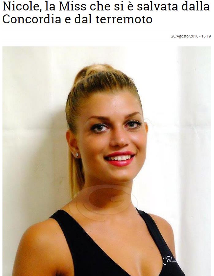 Η Νικόλ ντι Μάριο συμμετείχε το βράδυ της Πέμπτης στα καλλιστεία για την ανάδειξη της “Μις Ούμπρια”, όμως το –υποχρεωτικό σε τέτοιους διαγωνισμούς– χαμόγελο δεν μπορούσε να φωτίσει το πρόσωπο της νεαρής φοιτήτριας, που την προηγούμενη νύχτα σώθηκε από τον σεισμό στο Αματρίτσε, όπως είχε σωθεί και πριν από τέσσερα χρόνια από το ναυάγιο του Κόστα Κονκόρντια.