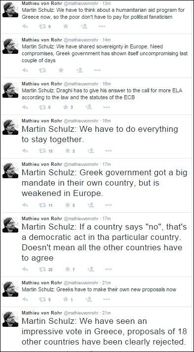 Σύμφωνα με όσα γράφει στο twitter ο δημοσιογράφος του Der Spiegel, Mathieu Von Rohr, ο κ. Σουλτς έκανε λόγο για μία εντυπωσιακή ψηφοφορία στην Ελλάδα και σημείωσε ότι οι προτάσεις των 18 χωρών απορρίφθηκαν.