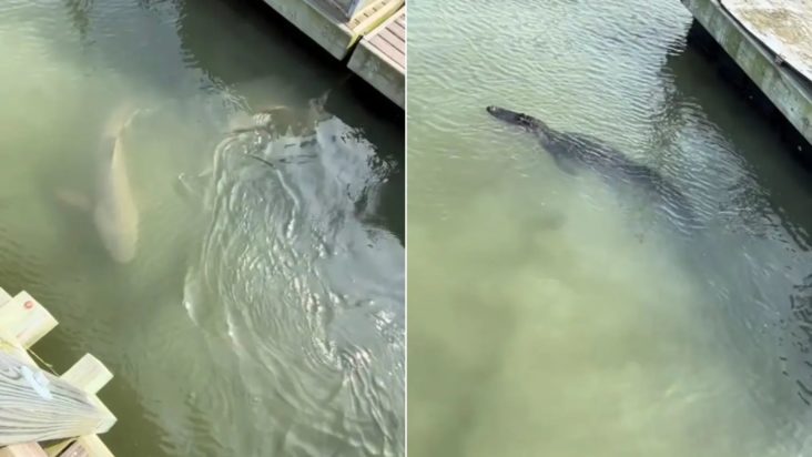 Πέντε καρχαρίες και ένας αλιγάτορας εντοπίστηκαν μαζί κοντά σε μια προβλήτα στο Hilton Head, με τα τεράστια θηλαστικά να κινούνται ανέμελα ενώ ο αλιγάτορας ξεκουραζόταν στη σκιά, σύμφωνα με βίντεο που κατέγραψαν έκπληκτοι παραθεριστές.