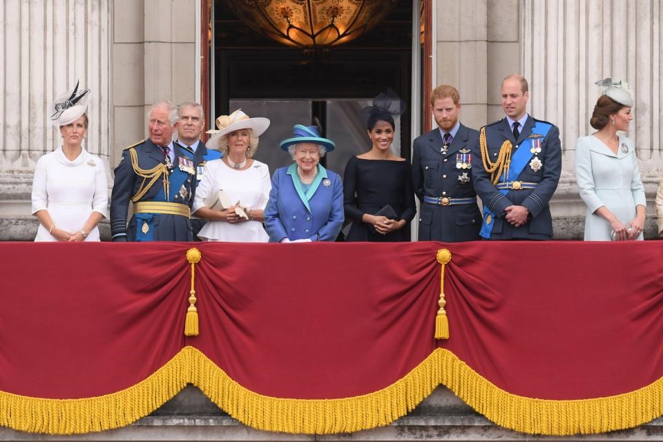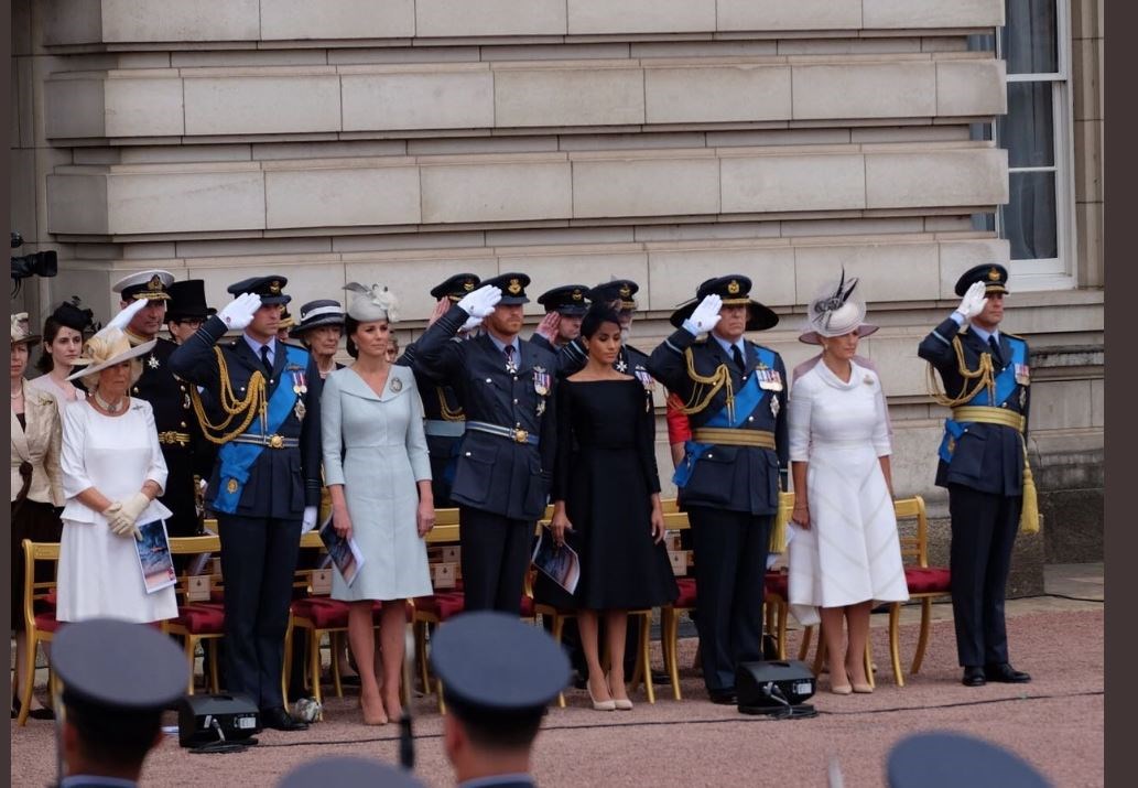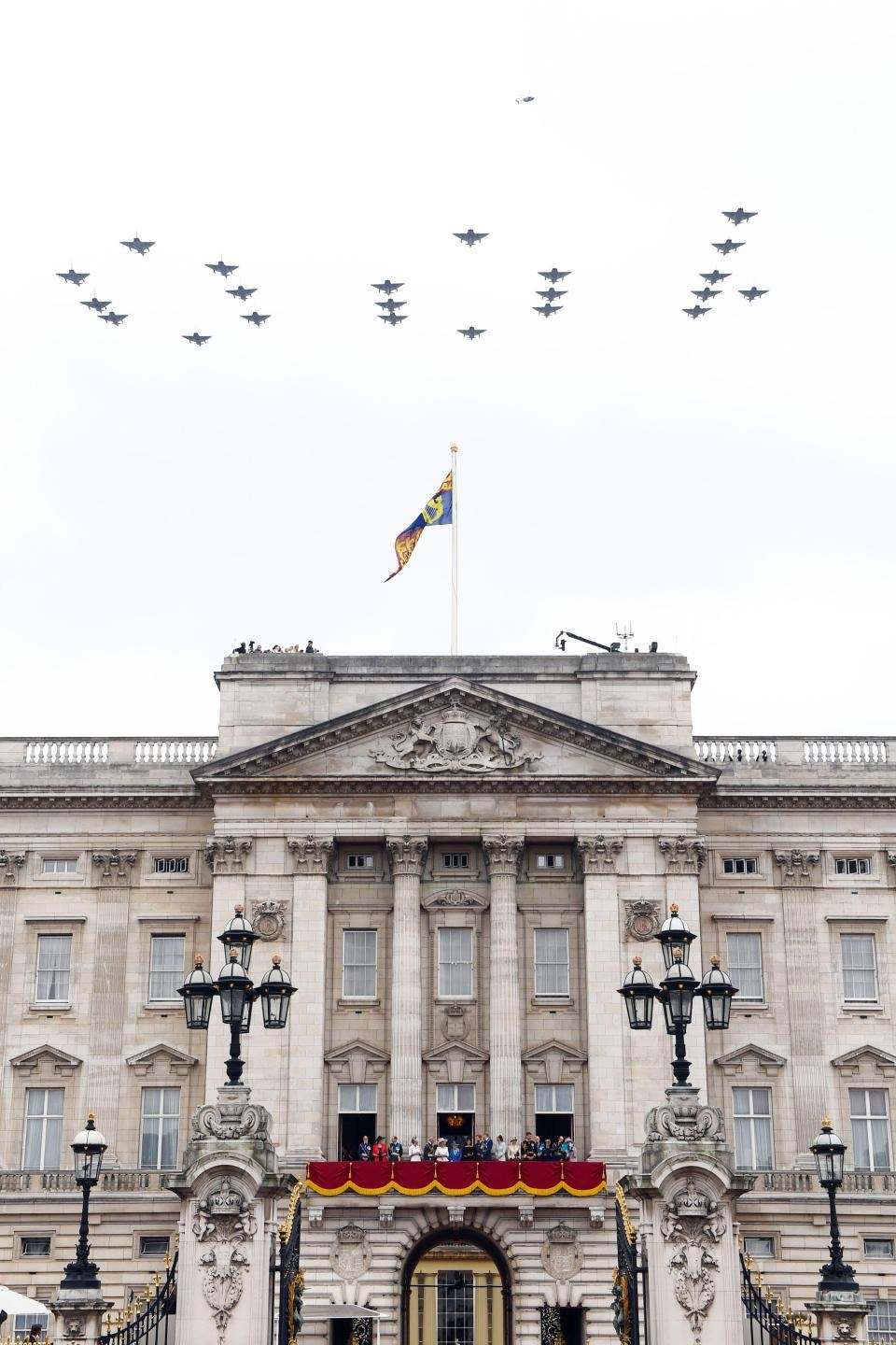 Η βασίλισσα Ελισάβετ καθώς και τα μέλη της βασιλικής οικογένειας, είναι συγκεντρωμένα στον εξώστη των ανακτόρων για να απολαύσουν το θέαμα, μετά τη λειτουργία που παρακολούθησαν το πρωί στο Αββαείο του Ουεστμίνστερ.