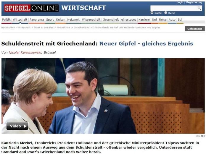 Η Καγκελάριος Α. Μέρκελ, ο Γάλλος πρόεδρος Φρανσουά Ολάντ και ο Έλληνας πρωθυπουργός Αλέξης Τσίπρας ξενύχτησαν αναζητώντας μια διέξοδο της διαφοράς χρέους, προφανώς μάταια, αναφέρει το Der Spiegel. Παράλληλα επισημαίνεται στο άρθρο η υποβάθμιση των ελληνικών ομολόγων από την S&P.