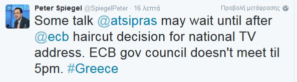 Την άποψη ότι ο Έλληνας Πρωθυπουργός, Αλέξης Τσίπρας θα πραγματοποιήσει το διάγγελμα του αμέσως μετά την απόφαση της ΕΚΤ, εξέφρασε ο δημοσιογράφος των Financial Times, Peter Spiegel