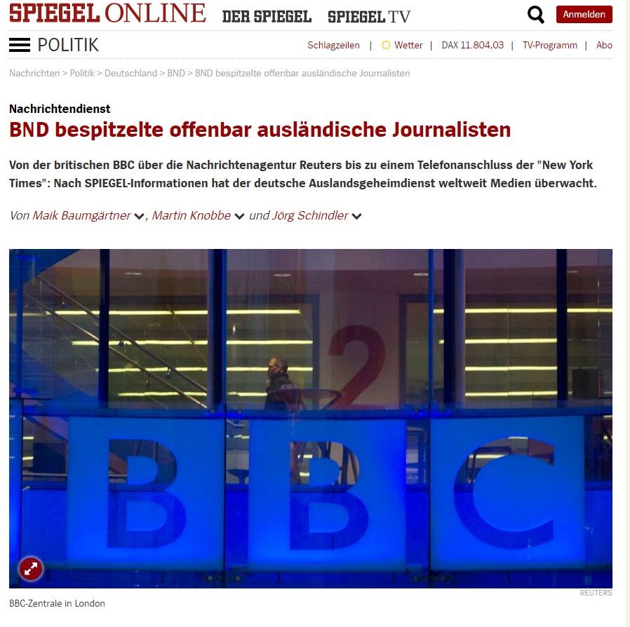 Το περιοδικό αποκάλυψε ότι η υπηρεσία πληροφοριών της Γερμανίας (BND) κατασκόπευε τους δημοσιογράφους μέσων ενημέρωσης ξένων χωρών, όπως του βρετανικού τηλεοπτικού δικτύου BBC, της αμερικανικής εφημερίδας New York Times και του πρακτορείου Reuters. Στο δημοσίευμα αναφέρεται ότι η BND συμπεριέλαβε από το 1999 τουλάχιστον 50 νούμερα τηλεφώνων, φαξ ή φαξ ή διευθύνσεις ηλεκτρονικού ταχυδρομείου δημοσιογράφων ή συντακτικών ομάδων στον κατάλογο υποκλοπών. Ταυτόχρονα, το περιοδικό δεν διευκρινίζει εάν οι μυστικές υπηρεσίες της Γερμανίας συνεχίζουν και σήμερα την παρακολούθηση.