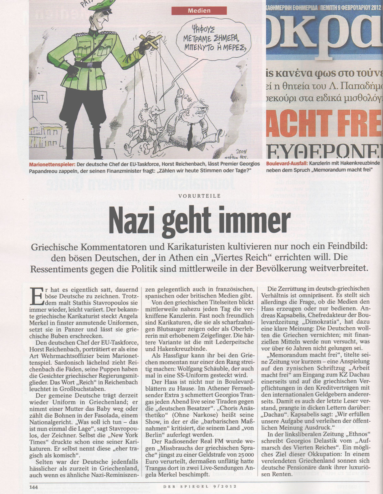 “Οι Έλληνες σχολιαστές και σκιτσογράφοι καλλιεργούν πλέον μόνο μία εχθρική εικόνα, αυτή των Γερμανών που θέλουν να εγκαθιδρύσουν ένα τέτερτο Ράϊχ στην Αθήνα” γράφουν οι δημοσιογράφοι του Γερμανικού περιοδικού Spiegel Julia Amalia Heyer και Ferry Batzoglou.”Παρ’ ότι έχει κουραστεί να ζωγραφίζει διαρκώς κακούς Γερμανούς, εξακολουθεί να το κάνει διαφοροποιώντας ελαφρώς τα σκίτσα” αναφέρει το δημοσίευμα για τον Στάθη Σταυρόπουλο και συνεχίζει “ο γνωστός Έλληνας σκιτσογράφος ντύνει την Άνγκελα Μέρκελ με στολές των Ναζί και την παρουσιάζει να τρομάζει τα Ελληνάκια. Τον Γερμανό επικεφαλής της ευρωπαϊκής ομάδας διάσωσης (Τaskforce), Χορστ Ράιχενμπαχ τον παρουσιάζει ως αξιωματικό της Βέρμαχτ που παίζει ως μαριονέτες τους Ελληνες πολιτικούς.”Εν τω μεταξύ οι ένστολοι “κακός Γερμανοί- αρπάζουν από μια μητέρα το παιδί της ή μετράνε τα φασόλια στη φασολάδα” και ο Στάθης λέει “Τι να κάνω, αυτή είναι η κατάσταση”.Το Γερμανικό περιοδικό επισημαίνει ότι ακόμα και η New York Times έχουν χρησιμοποιήσει σκίτσα του Στάθη ενώ αναφέρει ότι ο ίδιος χαρακτηρίζει τα έργα του “περισσότερο τραγικά παρά κωμικά”.