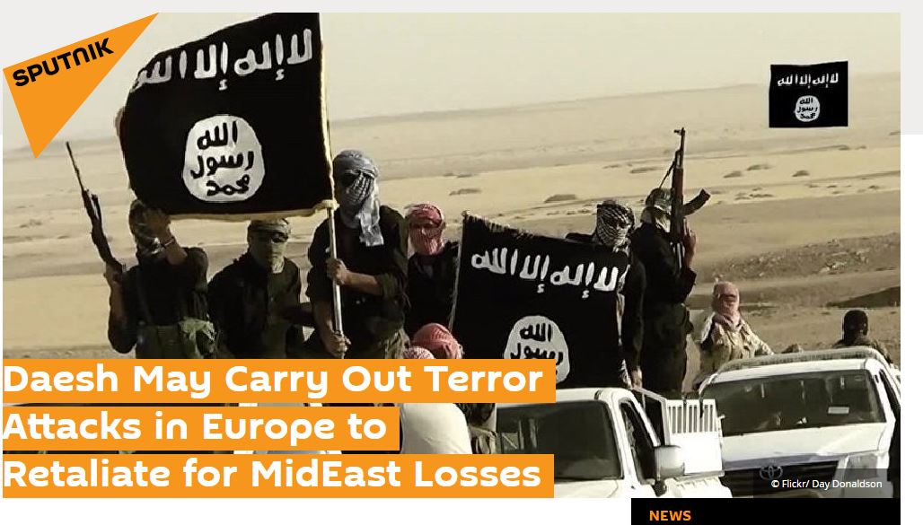 Το Ισλαμικό Κράτος θα αποπειραθεί να διαπράξει τρομοκρατικές επιθέσεις σε ευρωπαϊκά κράτη σε αντίποινα για τις απώλειες που έχει υποστεί στη Μέση Ανατολή, όπου βρίσκονται υπό πολιορκία τα προπύργιά της οργάνωσης τόσο στο Ιράκ όσο και στη Συρία από τις ιρακινές δυνάμεις και τις Συριακές Δημοκρατικές Δυνάμεις, που υποστηρίζονται από τον διεθνή συνασπισμό υπό την ηγεσία των ΗΠΑ, αναφέρει σε δημοσίευμα του το ρωσικό Sputnik.