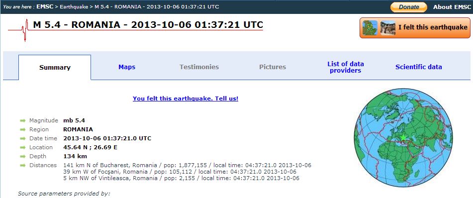Το εστιακό βάθος μετρήθηκε στα 134 χιλιόμετρα, ενώ το επίκεντρο εντοπίστηκε 141 χιλιόμετρα βόρεια της ρουμανικής πρωτεύουσας, το Βουκουρέστι, και 5 χιλιόμετρα βορειοδυτικά της πόλης Βιντιλάσκα.