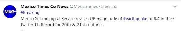 Το σεισμολογικό κέντρο του Μεξικό υπολόγισε τον ισχυρό σεισμό που έπληξε τη χώρα στα 8,4 Ρίχτερ, σημειώνοντας πως είναι ο ισχυρότερος που έχει καταγραφεί τον 20ό, αλλά και τον 21ο αιώνα.