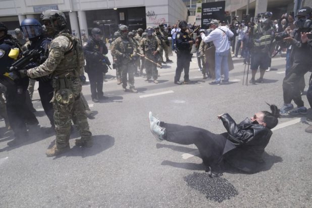 Η αστυνομία απάντησε με χρήση δακρυγόνων και πλαστικών σφαιρών -που θεωρητικά δεν είναι φονικές- προκειμένου να διαλύσει τα πλήθη, ενώ την ίδια στιγμή έφθαναν στην πόλη μέλη της Εθνοφρουράς που είχε αποστείλει ο Ντόναλντ Τραμπ.