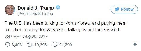 Ο αμερικανός πρόεδρος επέμεινε μέσω twitter στη σκληρή ρητορική, αναφέροντας σε ανάρτησή του την Τετάρτη πως «Οι ΗΠΑ συνομιλούν με τη Βόρεια Κορέα και τους πληρώνουν χρήματα εκβιαστικά, εδώ και 25 χρόνια. Τα λόγια δεν είναι η λύση», προκαλώντας αντιδράσεις.