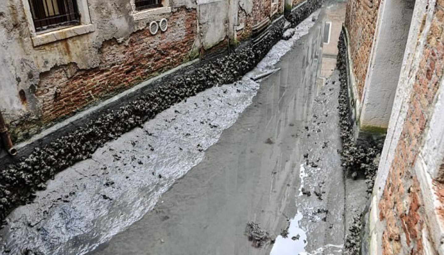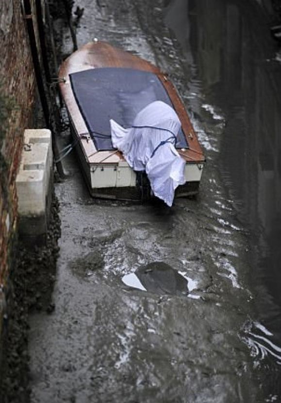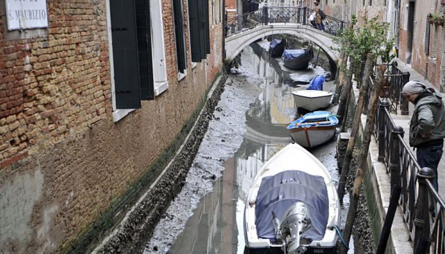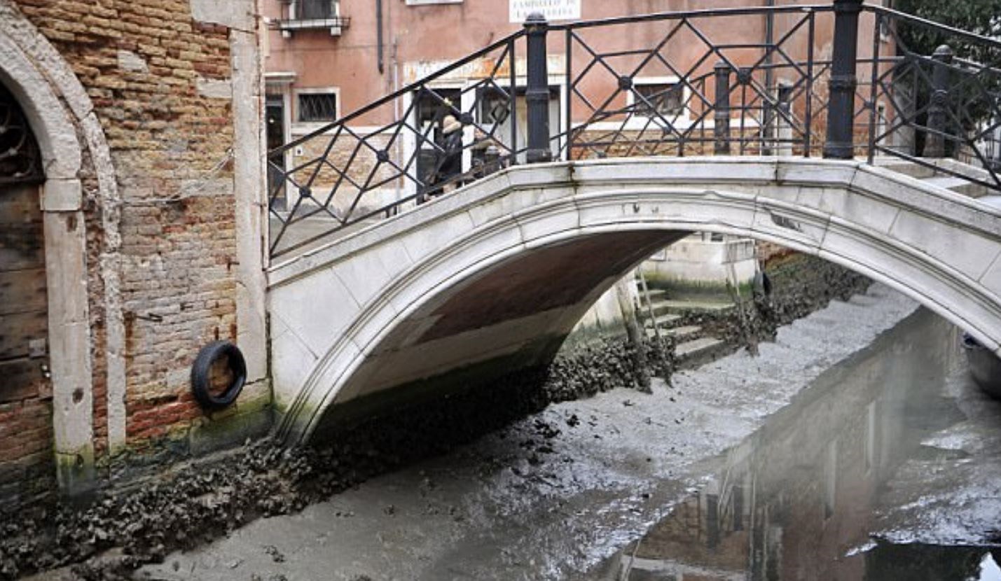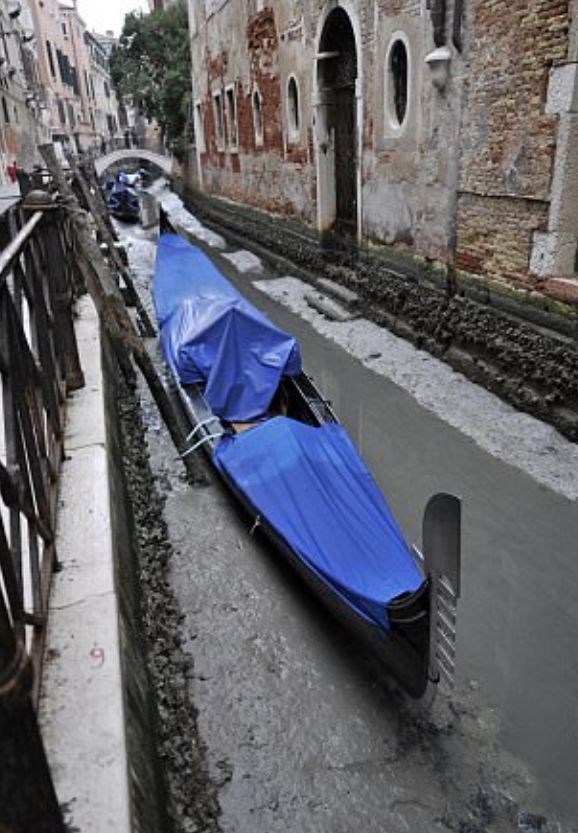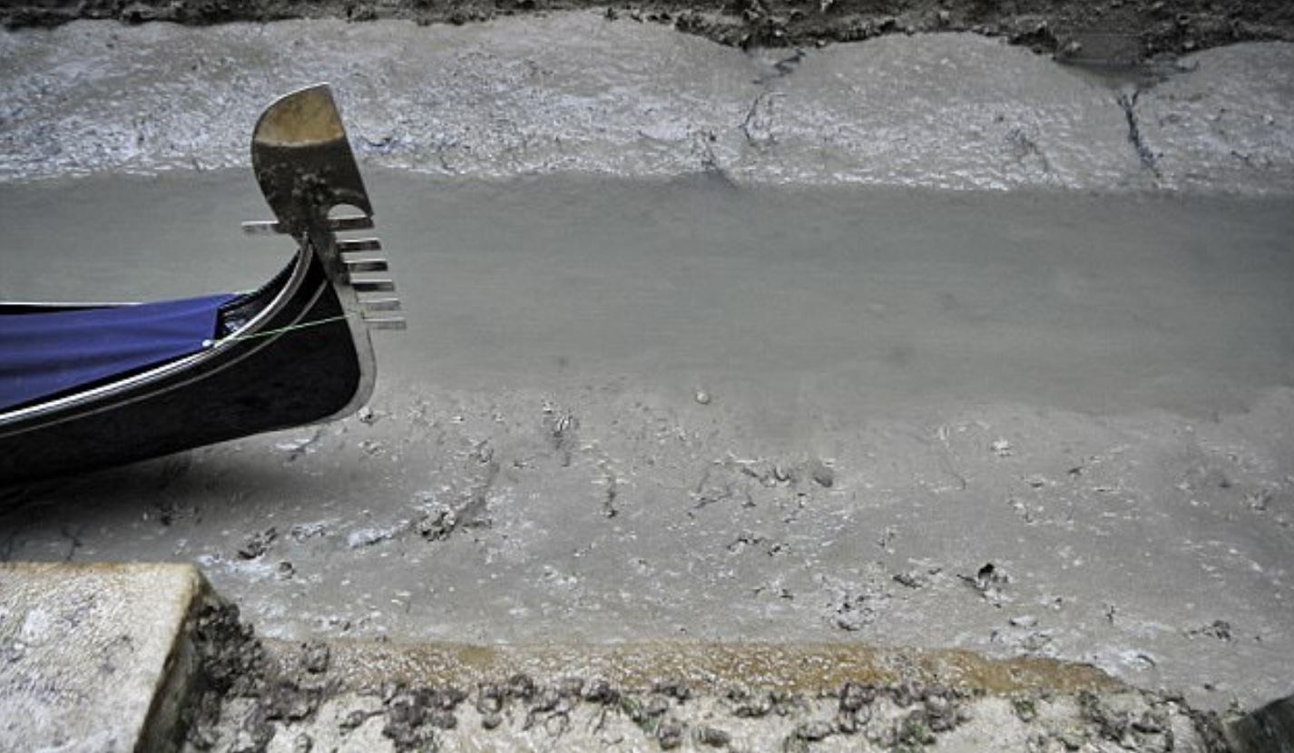 Τα ασυνήθιστα για την Ιταλία καιρικά φαινόμενα του τελευταίου διαστήματος είχαν ως αποτέλεσμα τα θρυλικά κανάλια της Βενετίας να στεγνώσουν, αναγκάζοντας τις περίφημες γόνδολες να «πλέουν» πάνω σε ξερή γη.