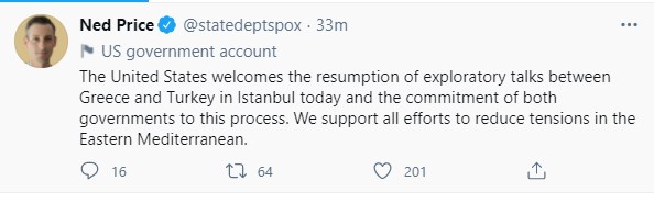 «Οι ΗΠΑ καλωσορίζουν τις διερευνητικές επαφές ανάμεσα στην Ελλάδα και την Τουρκία που έγιναν σήμερα στην Κωνσταντινούπολη και χαιρετίζει την επανάληψη της μακράς δέσμευσης και των δύο κυβερνήσεων», αναφέρει μεταξύ άλλων στο tweet του ο κ. Πράις. «Υποστηρίζουμε όλες τις προσπάθειες για τη μείωση της έντασης στην ανατολική Μεσόγειο», συμπληρώνει στην ανάρτησή του ο εκπρόσωπος του αμερικανικού υπουργείου Εξωτερικών.