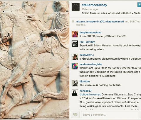 Μια φωτογραφία από τα ελληνικά γλυπτά του Βρετανικού Μουσείου που ανέβασε η διάσημη σχεδιάστρια μόδας Στέλλα Μακάρτνεϊ στο Instagram έγινε η αιτία μιας ιντερνετικής αψιμαχίας.