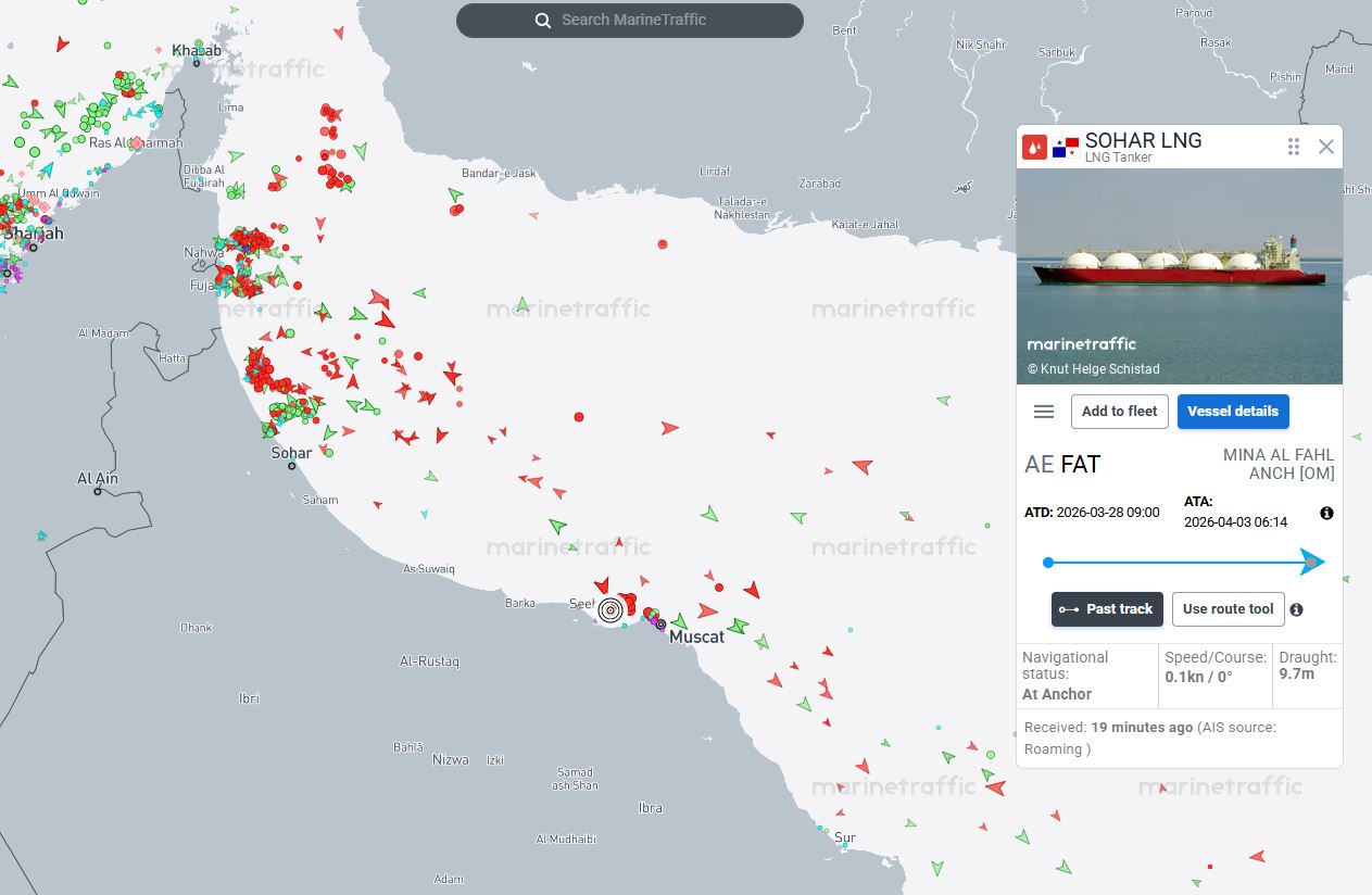 Σύμφωνα με τα δεδομένα εντοπισμού πλοίων, το Sohar LNG —το οποίο φαίνεται να ταξιδεύει χωρίς φορτίο— κινείται πλέον ανατολικά, έχοντας αλλάξει τον προορισμό του προς τον τερματικό σταθμό εξαγωγής Qalhat LNG στο Ομάν.