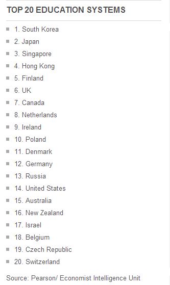 Στην κορυφή της λίστας φιγουράρει περήφανα η Νότια Κορέα και ακολουθούν η Ιαπωνία, η Σιγκαπούρη και το Χονγκ Κονγκ. Σύμφωνα με την έκθεση η μεγάλη άνοδος των Ασιατικών χωρών στον εκπαιδευτικό τομέα οφείλεται στην στενή συνεργασία οικογένειας, μαθητών και εκπαιδευτικής κοινότητας, καθώς και στον σεβασμό που τρέφουν σε αυτές τις χώρες για τους εκπαιδευτικούς.