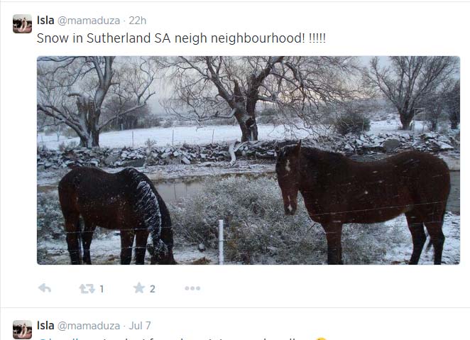 Ακόμα και στο Κέιπ Τάουν ο υδράργυρος πλησίασε το 0, ενώ ασθενής χιονόπτωση σημειώθηκε στη περιοχή Sutherland, περίπου στα 1450 μέτρα .