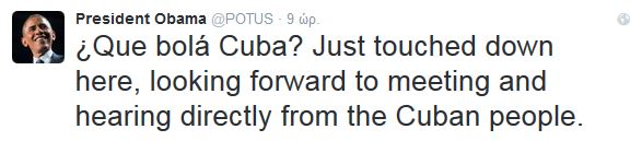 «Πώς πάει, Κούβα;» έγραψε ο Αμερικανός πρόεδρος στο twitter, καθώς το προεδρικό αεροσκάφος προσγειωνόταν στο διεθνές αεροδρόμιο Jose Marti της Αβάνας.