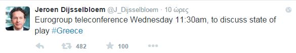 Όπως έγραψε και στο Twitter ο πρόεδρος του Eurogroup, Γερούν Ντάισελμπλουμ: «Την Τετάρτη στις 11:30 (12:30 ώρα Ελλάδας) είναι η τηλεδιάσκεψη του Eurogroup, για να συζητηθεί η κατάσταση της Ελλάδας».