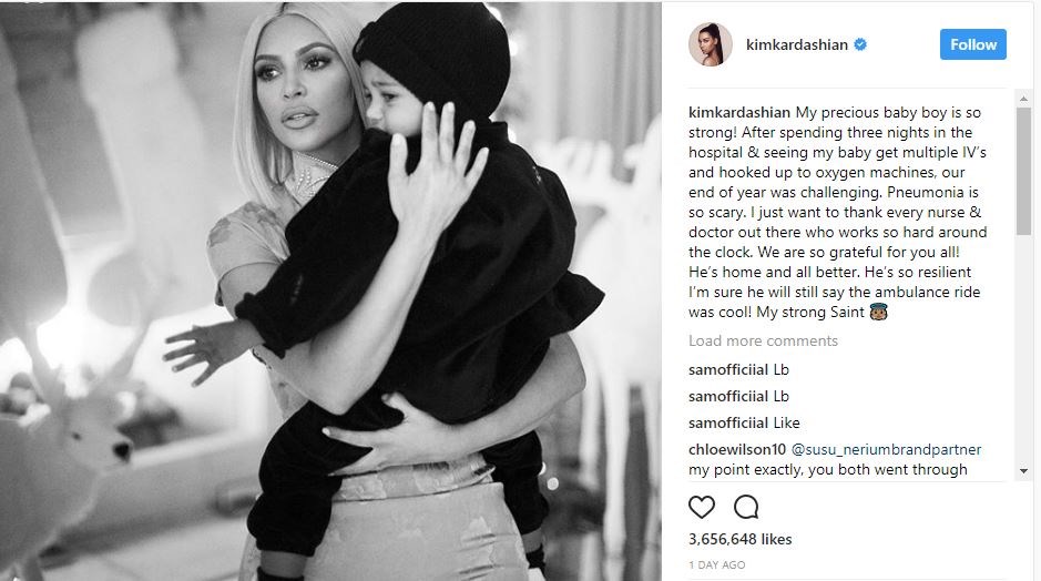 Στο νοσοκομείο διακομίστηκε ο δίχρονος γιος της ΚιμΚαρντάσιαν και του Κάνιε Γουέστ, ο μικρός Σεντ Γουέστ. Με ανάρτησή της στο Instagram, η Κιμ Καρντάσιαν ενημέρωσε τους εκατομμύρια followers της πως ο γιος της έδωσε μάχη με την πνευμονία και χρειάστηκε να νοσηλευτεί για αρκετές ημέρες.Μάλιστα, δεν παρέλειψε να ευχαριστήσει τους γιατρούς και τις νοσοκόμες για τη δουλειά που έκαναν και τη φροντίδα που προσέφεραν στον γιο της.Δείτε την ανάρτηση:
