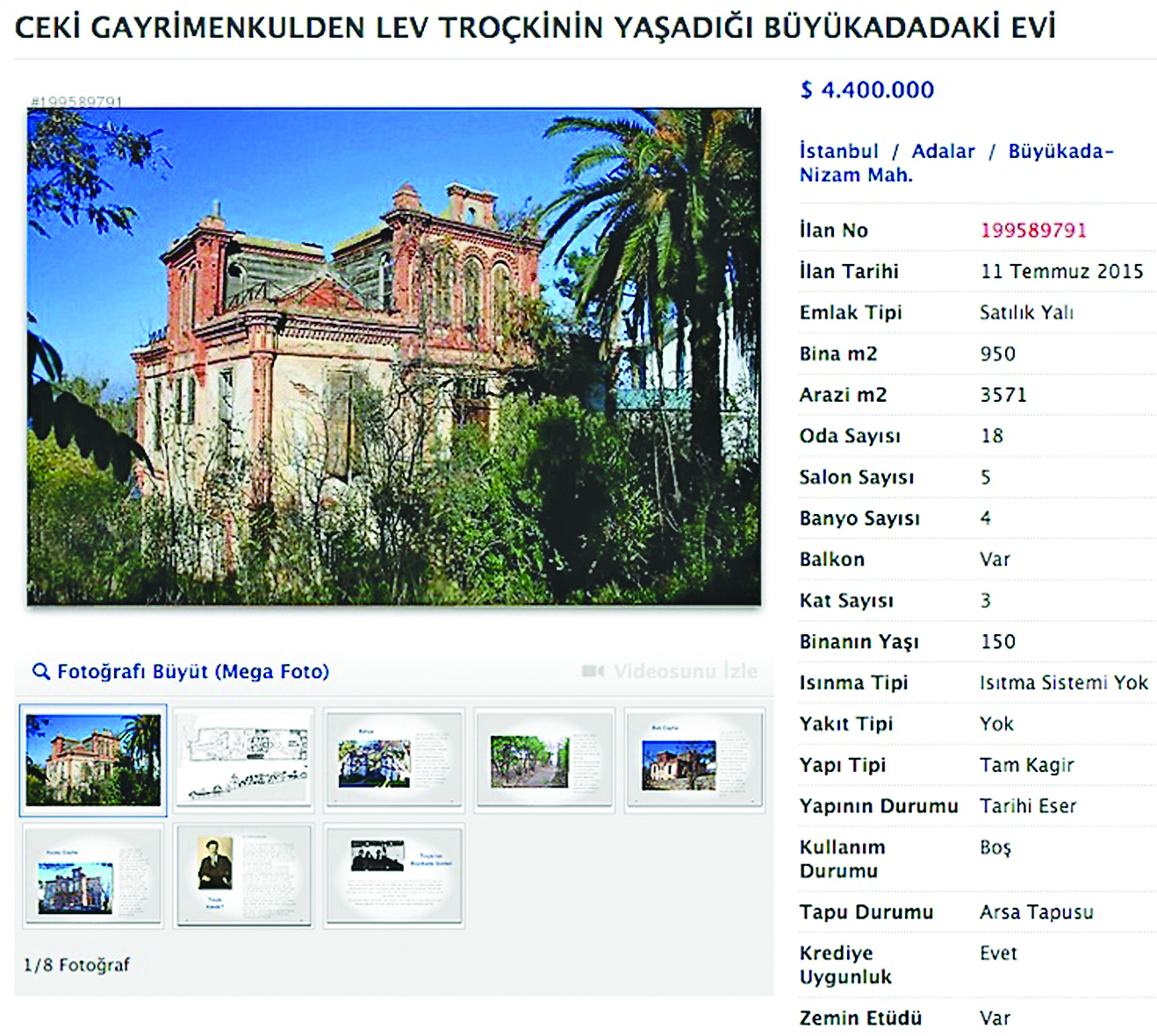Σύμφωνα με την αγγελία που δημοσιεύθηκε σήμερα στην εφημερίδα Χουριέτ, η τεράστια κατοικία των 950 τ.μ. που βλέπει τη θάλασσα του Μαρμαρά πωλείται προς 4,4 εκατομμύρια δολάρια. Το τριώροφο σπίτι, με 18 δωμάτια και πέντε μπάνια, κατασκευάστηκε πριν 150 χρόνια και βρίσκεται σε ένα οικόπεδο 3.600 τ.μ.