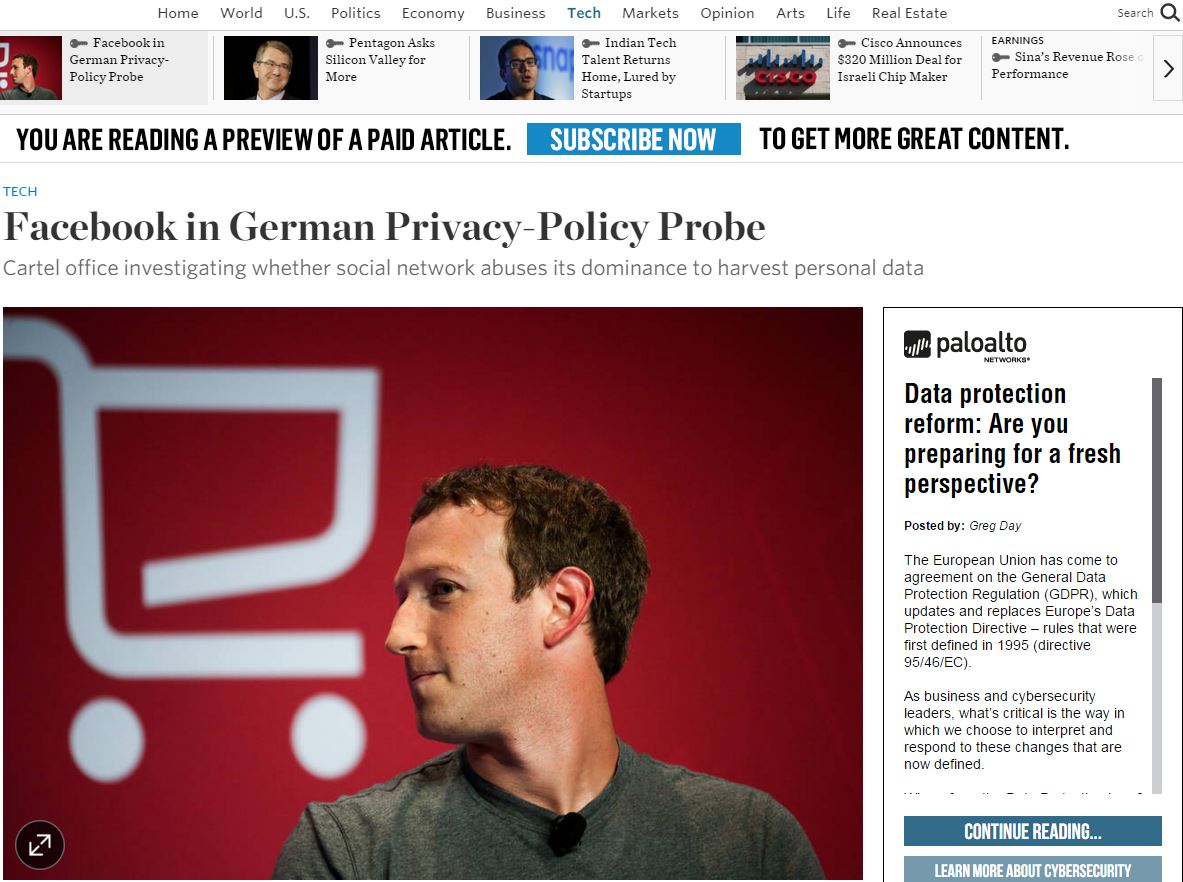 Όπως αναφέρει δημοσίευμα της «The Wall Street Journal» το Facebook ενδέχεται να εκμεταλλεύεται «ενδεχόμενη μονοπωλιακή του θέση στην αγορά», προκειμένου να εξαναγκάσει τους χρήστες στο να συναινέσουν στη συλλογή «μεγάλου αριθμού προσωπικών δεδομένων από ποικίλες πηγές», όπως γνωστοποίησε η Επιτροπή.