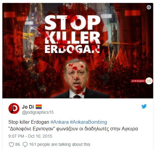 Η αναφορά στον Erdogan, είχε γίνει με αφορμή την επίθεση στην Άγκυρα, το 2015 και ανέφερε το τι φώναζαν οι Τούρκοι, οι οποίοι είχαν κατέβει στο δρόμο. “Δολοφόνε Erdogan” φώναζαν και αυτό περιέγραψε η εικόνα με έναν αρκετά ανάγλυφο τρόπο. Έκτοτε φυσικά, ο Erdogan έχει προχωρήσει σε πολύ χειρότερες τακτικές και αυτό που επιθυμεί στην παρούσα φάση είναι να διαγραφεί κάθε ίχνος από τις διαφορετικές φωνές – όχι μόνο μέσα στην Τουρκία – αλλά και παγκόσμια μέσω του διαδικτύου.