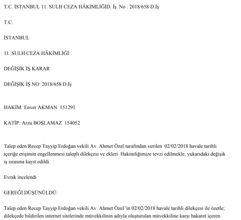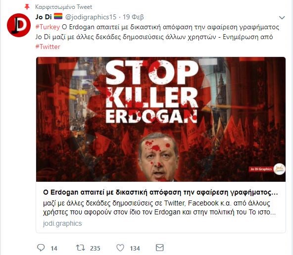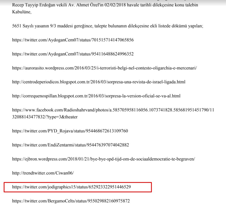 Σύμφωνα με τα όσα αναφέρει στο προσωπικό του ιστολόγιο, ο Έλληνας γραφίστας, έλαβε ένα email από το νομικό τμήμα του Twitter. Σε αυτό έχει επισυναφθεί απόφαση δικαστηρίου της Κωνσταντινούπολης, σύμφωνα με την οποία απαιτείται η διαγραφή δημοσιεύσεων από διάφορους χρήστες σε κοινωνικά δίκτυα, που αφορούν στον Τούρκο Πρόεδρο.