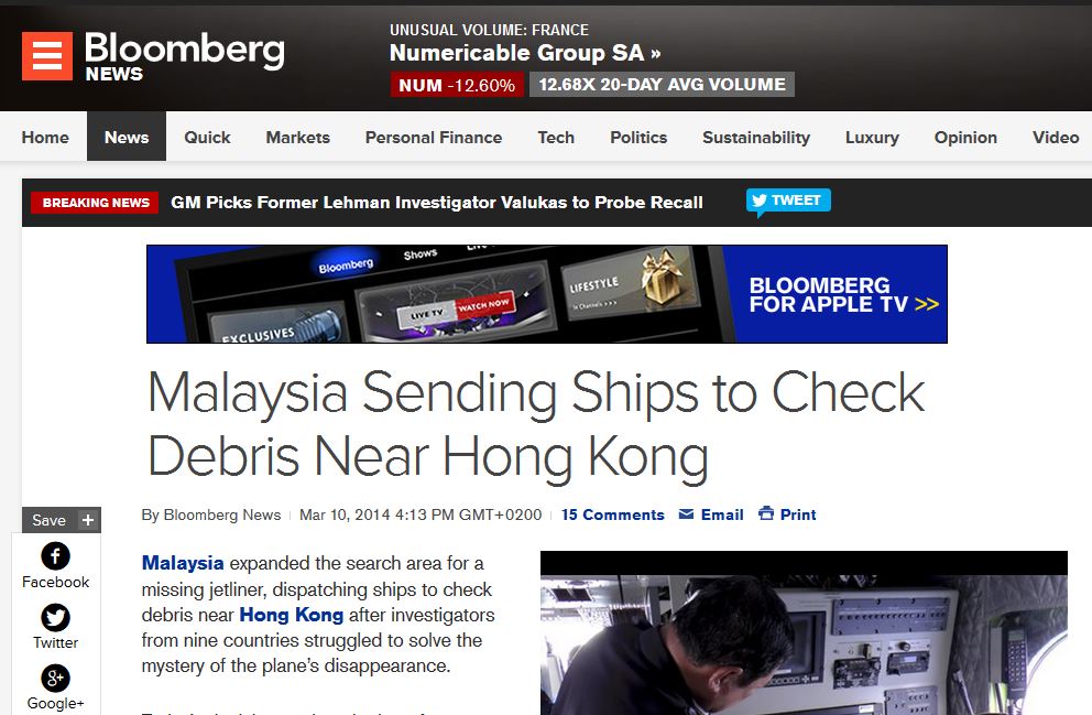 Συντρίμμια εντοπίστηκαν, σύμφωνα με το δίκτυο Bloomberg, κοντά στο Χονγκ Κονγκ, αλλα ακόμη είναι άγνωστο εάν συνδέονται με το αεροσκάφος της Malaysia Airlines,του οποίου η τύχη αγνοείται από το Σάββατο.