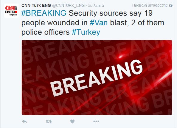 Η πολύ ισχυρή έκρηξη που σημειώθηκε στην πόλη Βαν της ανατολικής Τουρκίας προκάλεσε τον τραυματισμό 19 ανθρώπων, μεταξύ των οποίων και δύο αστυνομικών, μετέδωσε το τηλεοπτικό δίκτυο CNN Turk, επικαλούμενο νεώτερο απολογισμό.