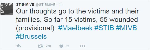 Επίσης, σύμφωνα με τον οργανισμό που είναι υπεύθυνος για το μετρό του Βελγίου, STIB-MIVB τουλάχιστον 15 άνθρωποι σκοτώθηκαν από την έκρηξη στο σταθμό Μααλμπέκ και 55 τραυματίστηκαν, εκ των οποίων οι δέκα βρίσκονται σε σοβαρή κατάσταση.