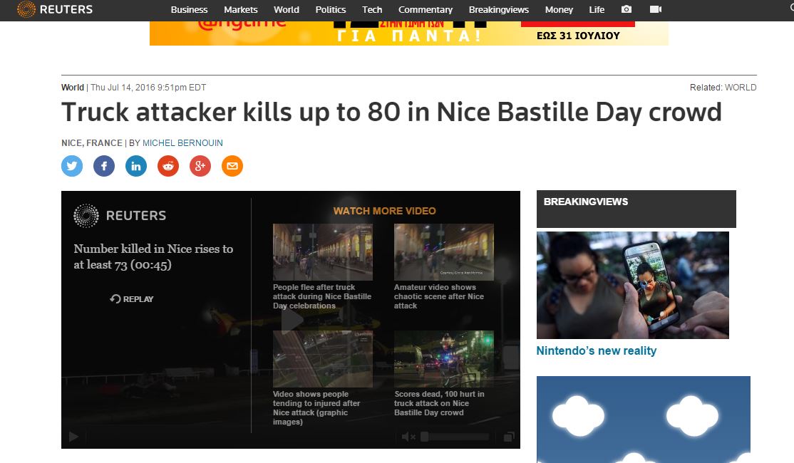 Σύμφωνα με το ρεπορτάζ του πρακτορείου Reuters, οι νεκροί από την επίθεση στη Νίκαια της Γαλλίας, αγγίζουν τους 80, ενώ οι τραυματίες είναι εκατοντάδες.