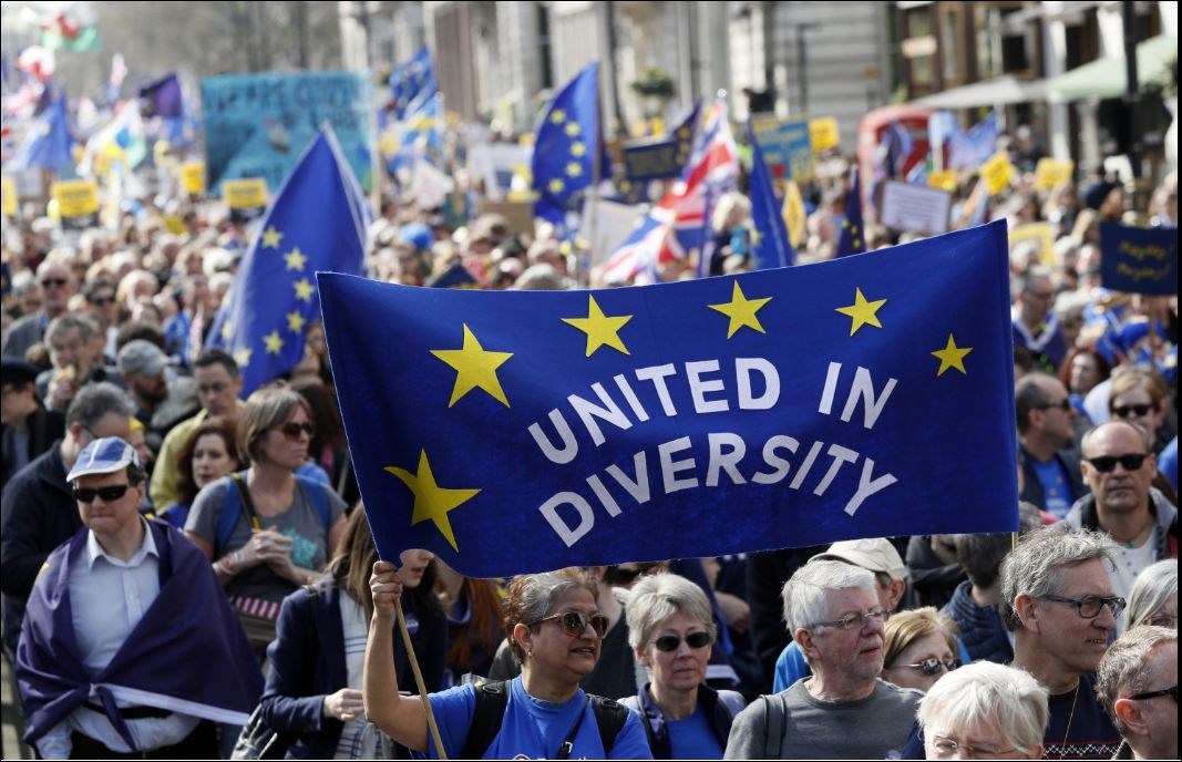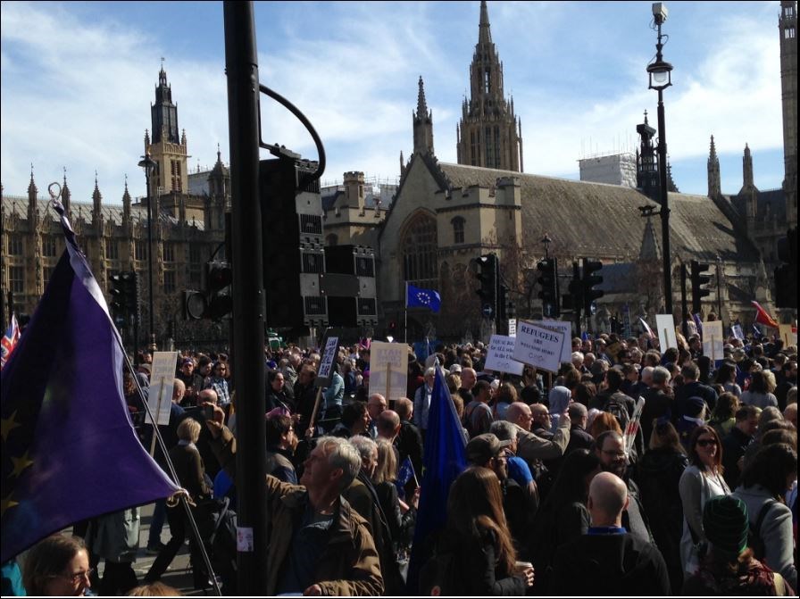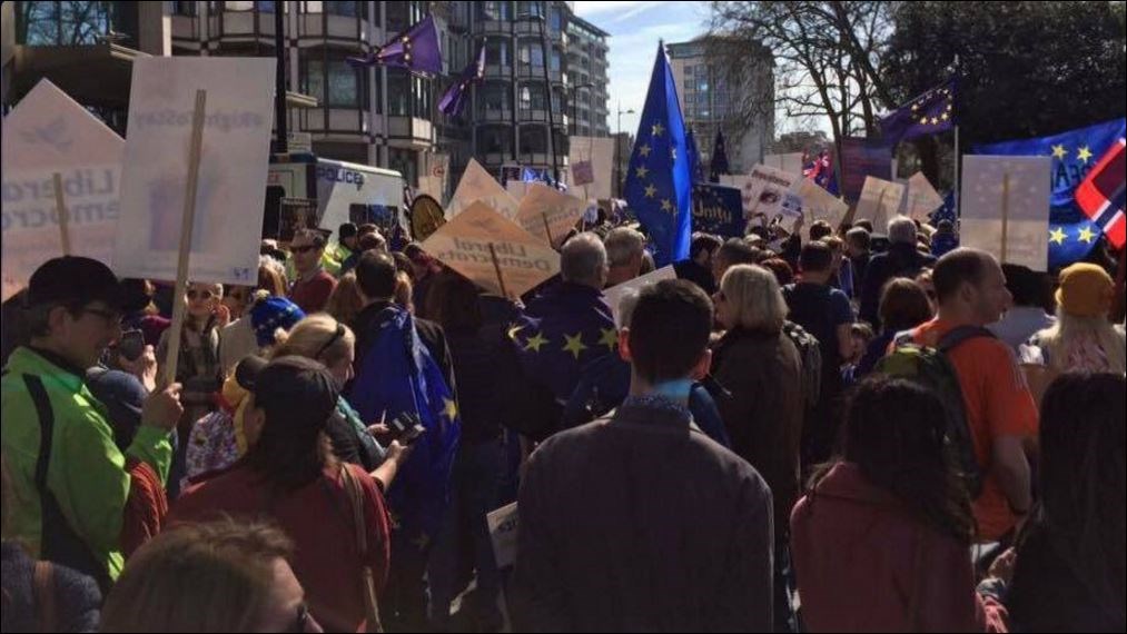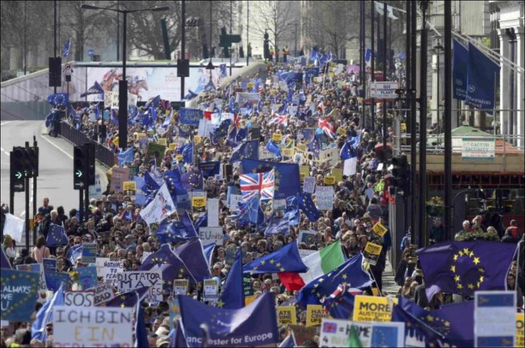 Χιλιάδες άνθρωποι κατέκλυσαν σήμερα τους δρόμους του Λονδίνου, για να διαμαρτυρηθούν κατά της αποχώρησης της Βρετανίας από την Ευρωπαϊκή Ένωση, τέσσερις ημέρες προτού η πρωθυπουργός της χώρας Τερέζα Μέι ενεργοποιήσει την επίσημη διαδικασία του «διαζυγίου» της Βρετανίας με την ΕΕ, στην οποία προσχώρησε πριν από 44 χρόνια.Η πορεία επρόκειτο να καταλήξει μπροστά από την πλατεία του Κοινοβουλίου, την περιοχή όπου την προηγούμενη εβδομάδα ο Καλίντ Μασούντ σκότωσε σε μια επίθεση 4 ανθρώπους προτού πέσει κι ο ίδιος νεκρός από αστυνομικά πυρά. Προτού ξεκινήσουν, οι διαδηλωτές τήρησαν ενός λεπτού σιγή στη μνήμη των θυμάτων.Την ίδια ώρα, πολλοί κρατούσαν σημαίες της Ευρωπαϊκής Ένωσης και πανό με συνθήματα όπως «Ποιο είναι το σχέδιο» και «Σταματήστε το Brexit», καθώς κατευθύνονταν προς το κοινοβούλιο.Σε άλλα πλακάτ αναγραφόταν απλά το σύνθημα «Χρόνια Πολλά ΕΕ», με αφορμή τα 60α γενέθλια της Ένωσης, που εορτάζονται σήμερα στη Ρώμη.Η Τζος Ντένις υποστηρίζει θερμά την παραμονή της χώρας της στην ΕΕ. Ταξίδεψε στο Λονδίνο από το Μπρίστολ στη δυτική Αγγλία, όπου το ποσοστό υπέρ της παραμονής στο δημοψήφισμα του περασμένου Ιουνίου ανήλθε σε 62% κι ενώ σε εθνικό επίπεδο τα ποσοστά υπέρ και κατά του Brexit διαμορφώθηκαν σε 52% και 48% αντίστοιχα.«Με μια τόσο μικρή διαφορά, δεν μπορώ να καταλάβω πώς ο οποιοσδήποτε μπορεί να υποστηρίξει ότι αυτή ήταν η βούληση του βρετανικού λαού», είπε στο πρακτορείο ειδήσεων Ρόιτερς.«Χάνουμε τόσα πολλά: σε σχέση με το περιβάλλον, σε επίπεδο πολιτικό και οικονομικό» πρόσθεσε.
