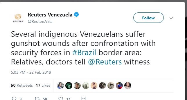 Ο ηγέτης της αντιπολίτευσης Χουάν Γκουαϊδό κατήγγειλε μέσω του Twitter ότι ο στρατός άνοιξε πυρ εναντίον των Πέμον που “βρίσκονταν στον σταθμό ελέγχου της Εθνοφρουράς”. Ζήτησε επίσης να συλληφθούν οι υπεύθυνοι για την καταστολή και “τη δολοφονία των αδελφών μας Πέμον (…) που στηρίζουν την ανθρωπιστική βοήθεια”.