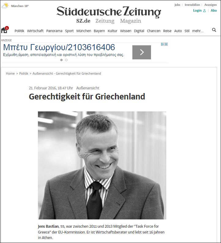 Η εφημερίδα Süddeutsche Zeitung δημοσιεύει σήμερα άρθρο του οικονομικού συμβούλου και πρώην μέλους της Ομάδας Δράσης της Κομισιόν για την Ελλάδα, Γενς Μπάστιαν. Το άρθρο που φέρει τον τίτλο «Δικαιοσύνη για την Ελλάδα» αναφέρεται στα μεγάλα βάρη που καλείται να σηκώσει η χώρα εν μέσω προσφυγικής και οικονομικής κρίσης.