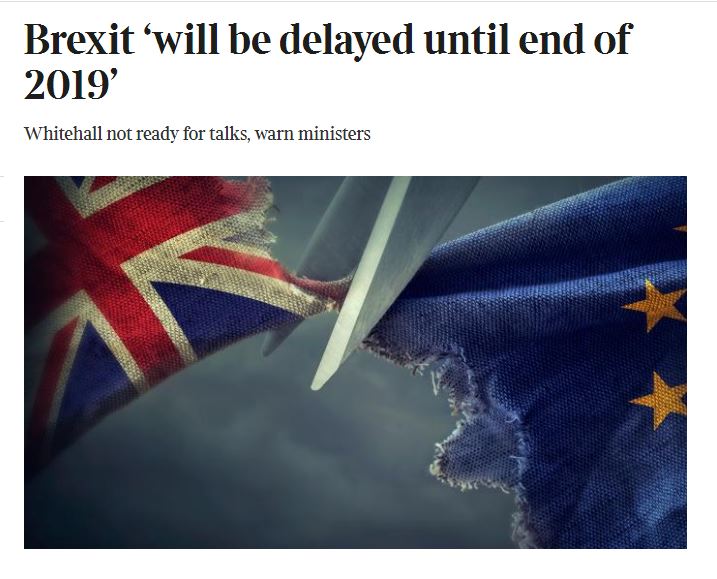 Ωστόσο σύμφωνα με τους Sunday Times, Βρετανοί υπουργοί έχουν προειδοποιήσει κατ’ιδίαν υψηλόβαθμους αξιωματούχους του χρηματοπιστωτικού τομέα του Σίτι του Λονδίνου ότι η προσφυγή στο άρθρο 50 μπορεί να γίνει στα τέλη του 2017, το οποίο θα αναβάλει και το Brexit για τα τέλη του 2019.